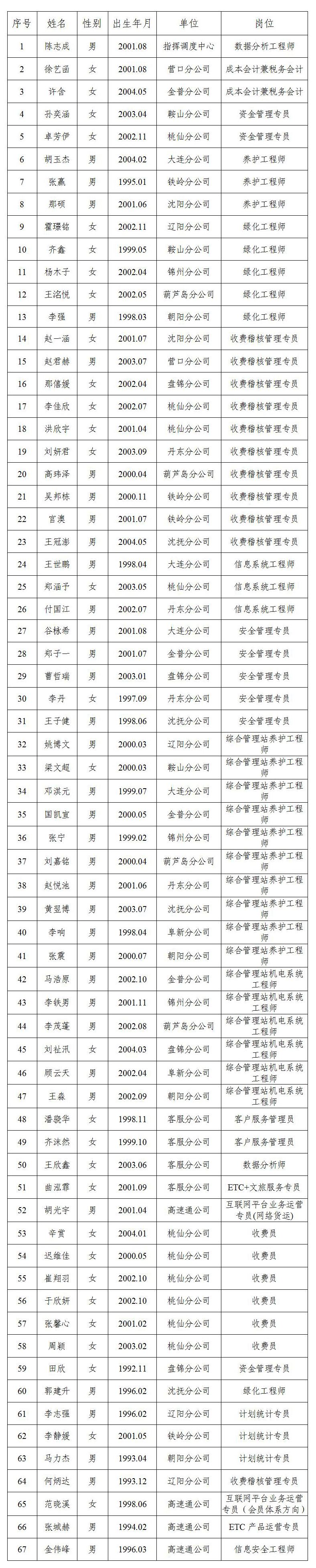 根據(jù)遼寧省高速公路運營管理有限責任公司招聘工作有關(guān)要求,經(jīng)過資格審核、筆試、面試、考察、體檢等程序,確定以下人員為擬聘用人員,現(xiàn)予以公示。公示期間如有問題,請向遼寧省高速公路運營管理有限責任公司致電反映。